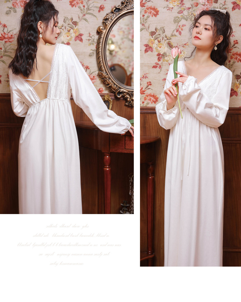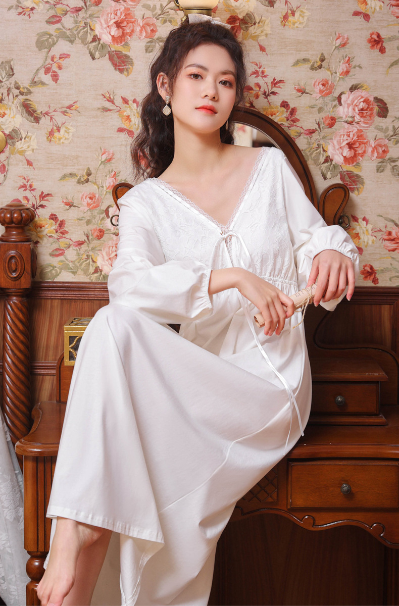 可愛い パジャマ レディース おしゃれ かわいい 長袖 ワンピース レース コットン Vネック 背中開き